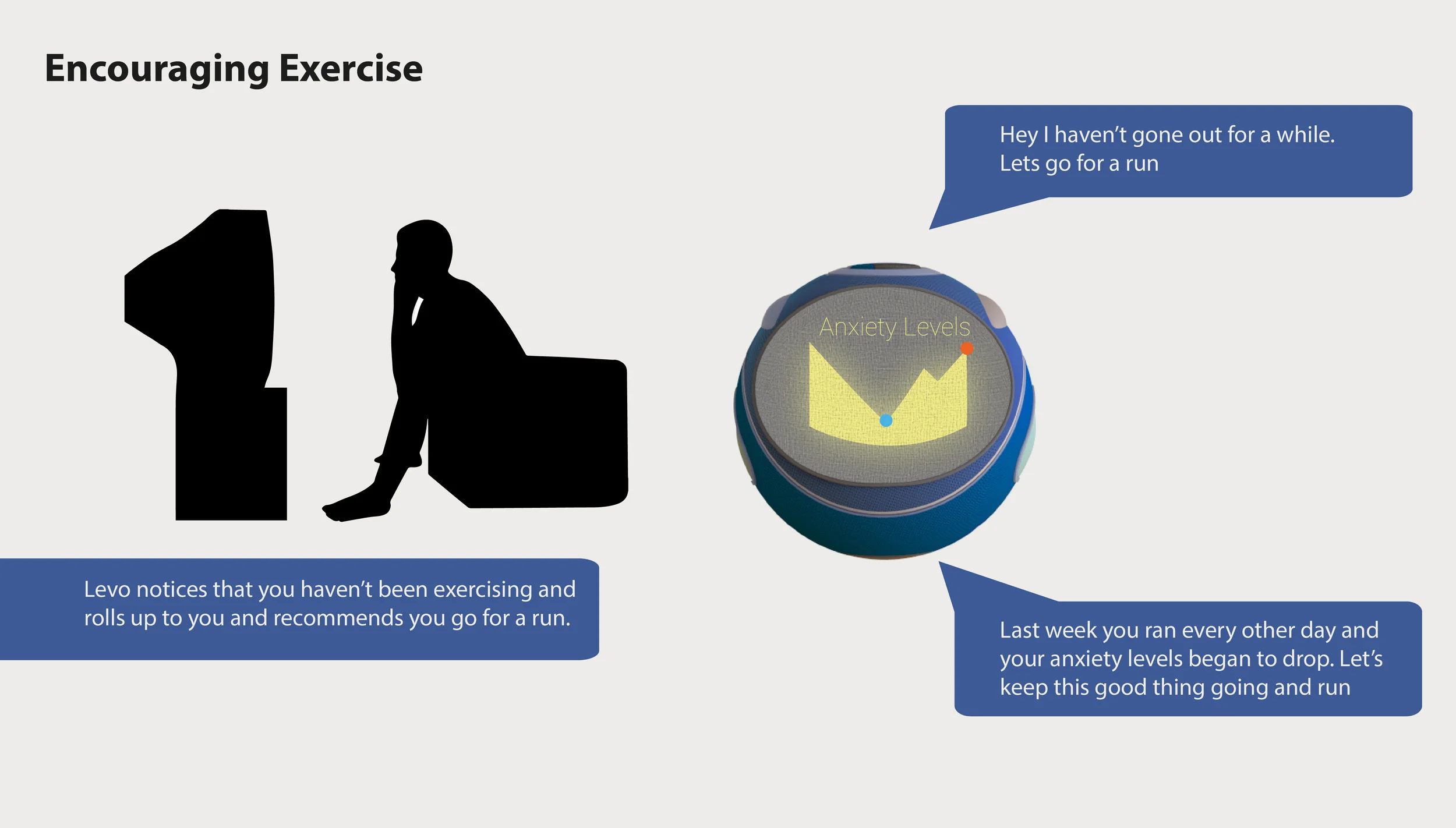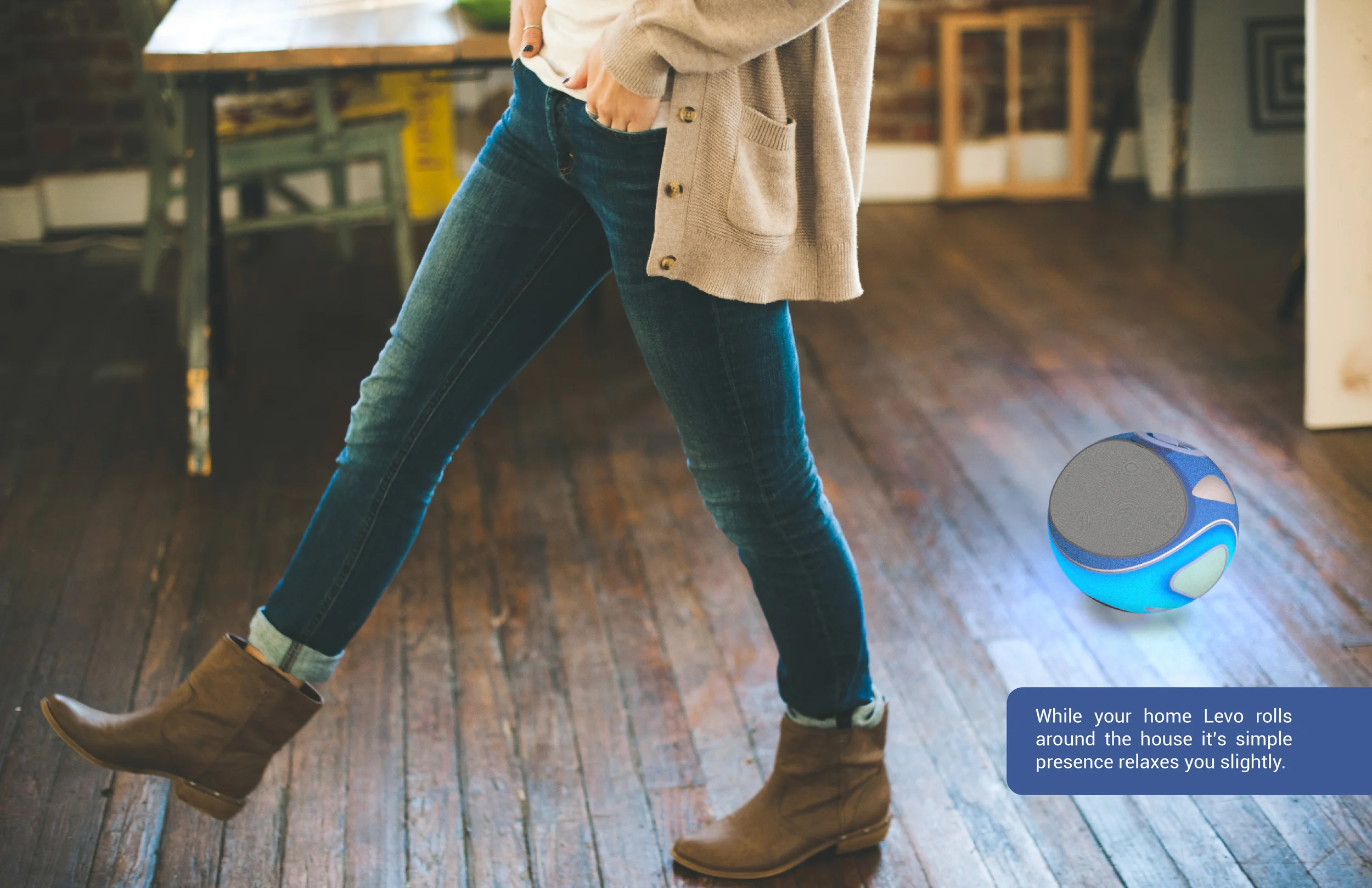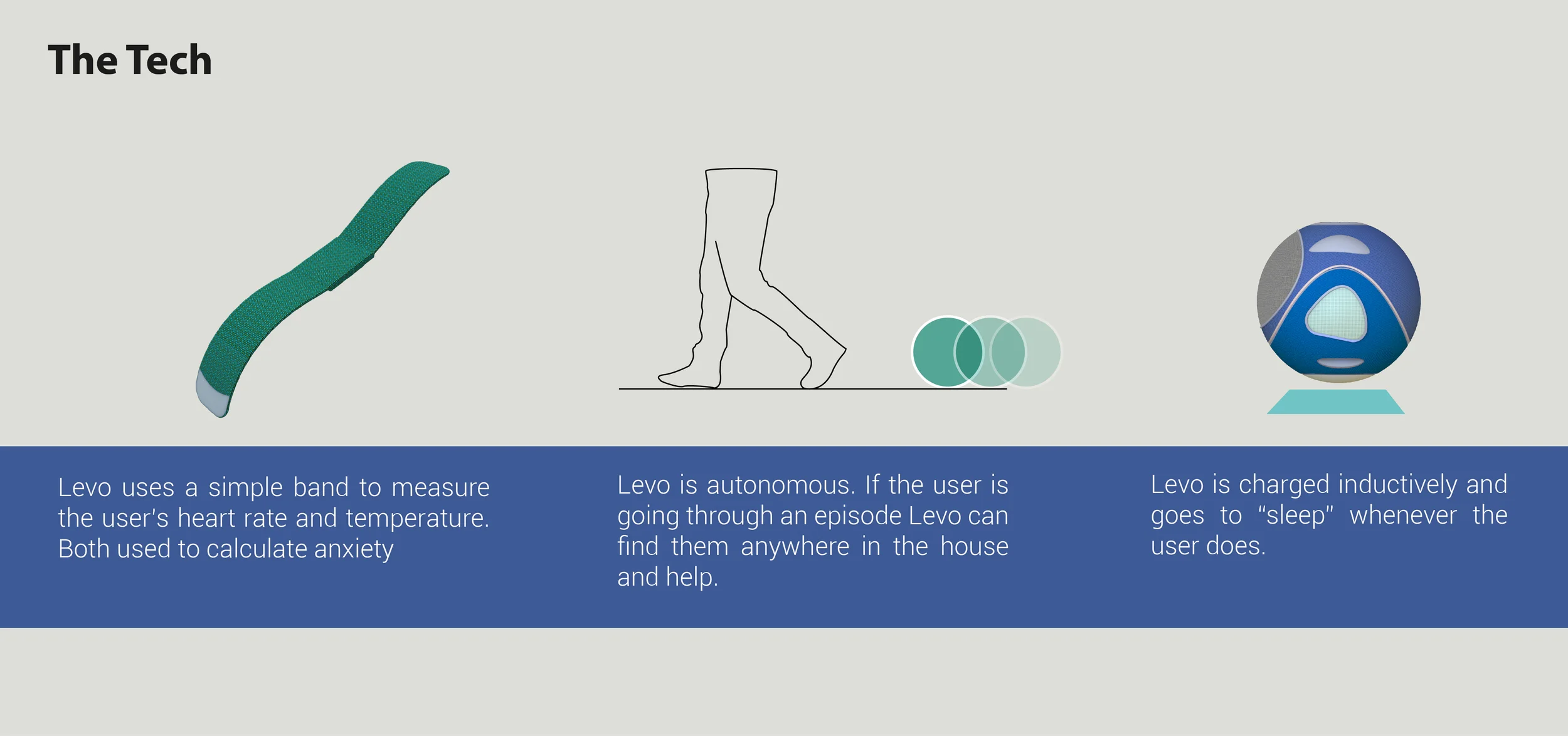 As you go about your day Levo rolls around the house exploring and keeping itself occupied. Levo monitors your anxiety levels through the bracelet you wear on your wrist. If it feels your anxiety levels are up it will start to hang around you.